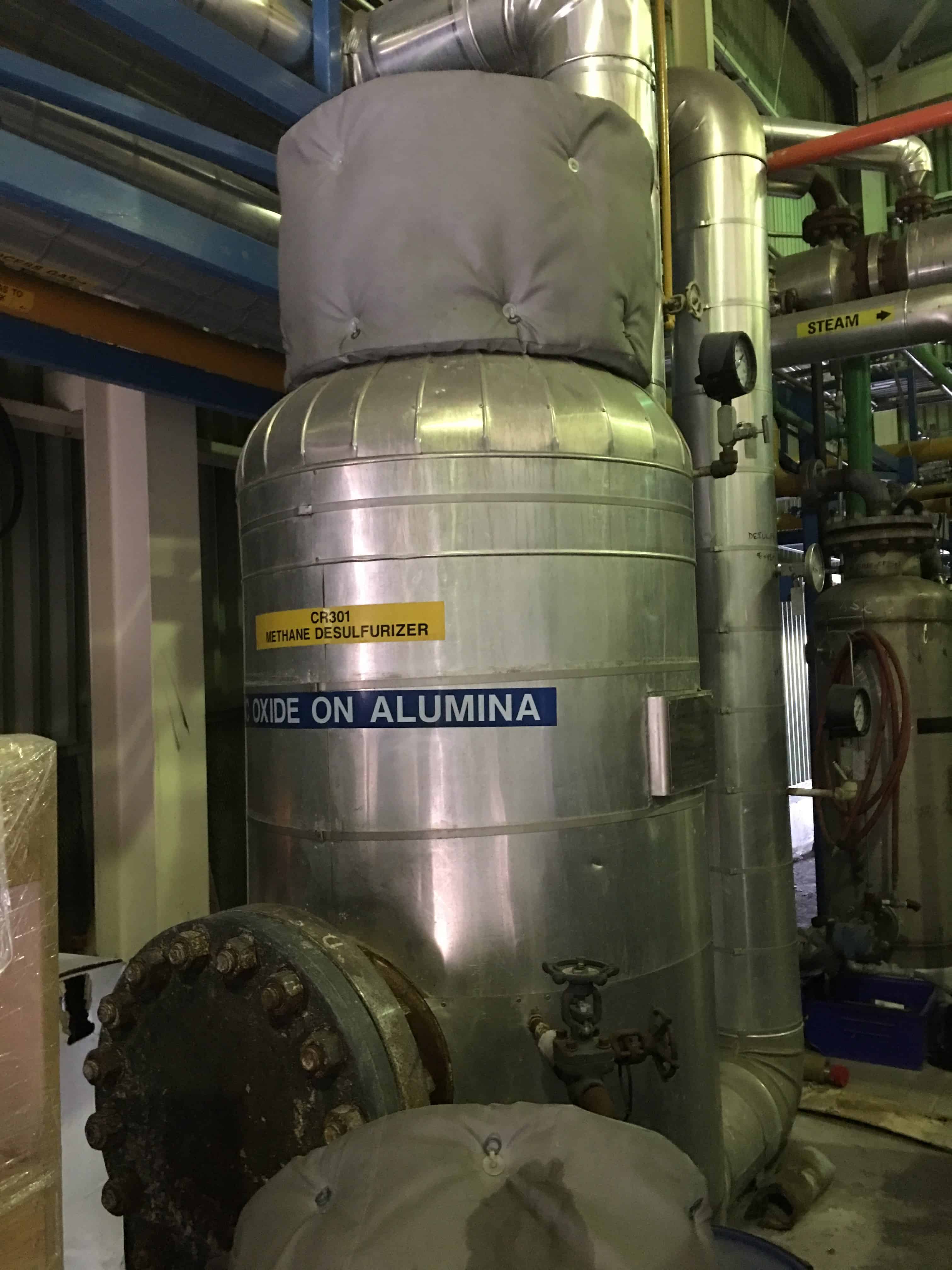 Used 1,500 Nm3/hr (55,000 SCFH) Glitsch Designed Steam-Methane-Reforming (SMR) process Hydrogen Plant built in 1995. Shutdown 2006. Natural gas feedstock. Reforming catalyst type G90-B. Include pressure swing absorption (PSA) hydrogen purification system. Product purity 99.99%, pressure 208 psig, temperature 100 °F, dew point -56 °C. Export steam 5410 lbs/hr at 250 psig, 407 °F. Electrical consumption 112 KW. Most equipment skid-mounted for easy relocation. Currently mothballed and under nitrogen blanket.