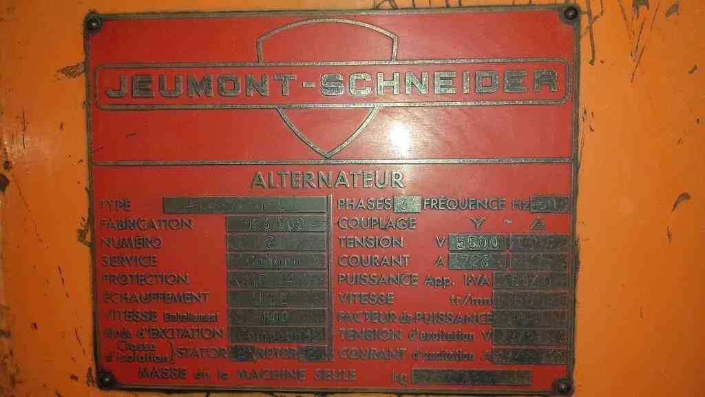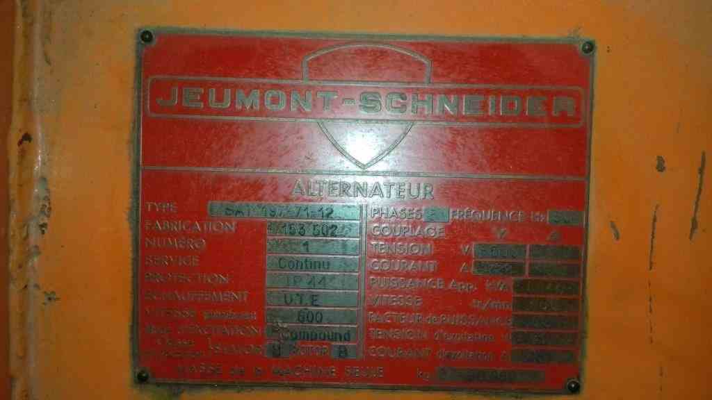 Used 11MW HFO Power plant consisting of (2) used 650HP turbocharged Diesel-HFO engines. Manufactured by S.E.M.T. Pielstick. Model 16PC2-2 V400. 7200Kw. 500 RPM. 60500 hrs. Motor numbers 2171 and 2172. Built 1971. (2) 5.5MW Jeumont-Schneider generators. Model SAT-197-71-12. Exhaust pipes equipped with NOx removal system. Exciter: compound rotor-stator. 5500V/728A/3ph/50Hz. Power Factor: 0.8. Serial #153502-1 and 153502-2. Includes auxiliary equipment: Controls, air compressors, water pumps, oil tanks, water tanks, engine heaters.