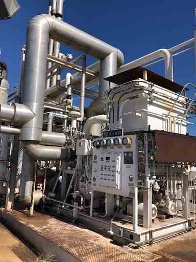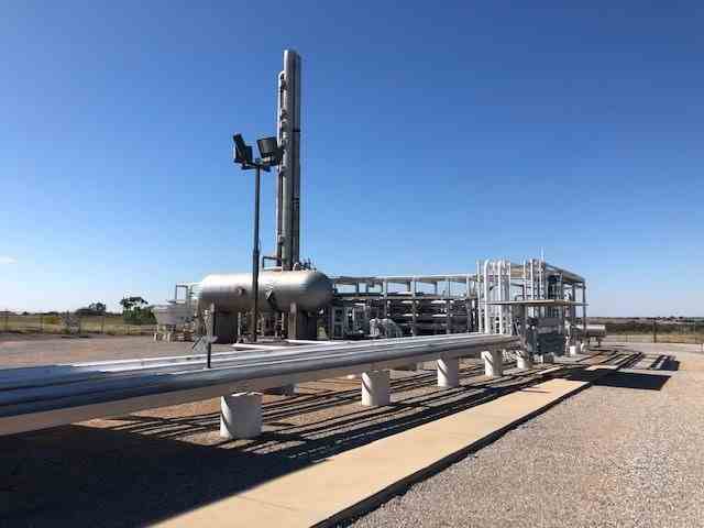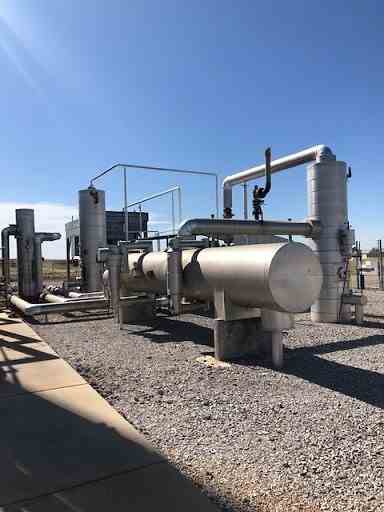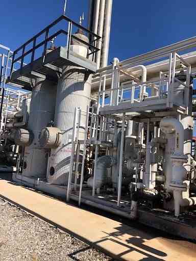 The inlet gas is fed to the plant at 550 psig. The water content of the inlet gas is reduced to less than 1 ppm by the TEG and molecular sieve dehydration. Dry gas flows to the cryogenic unit where it is cooled to sub-zero temperature. The mixed cold stream flows into the expander inlet separator to separate the liquids from the gas. The liquids flow to the demethanizer to remove methane. The cold gas stream goes to the turbo-expander to condense more liquids, which flow to the de-ethanizer. The plant has a compressor package consisting of a Caterpillar 3516 engine driving an Ariel JGT4 2-stage gas compressor, which re-compresses the residue gas (higher methane content) from the plant for delivery to pipeline.