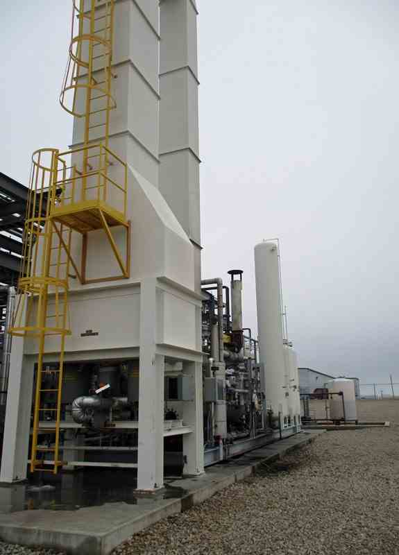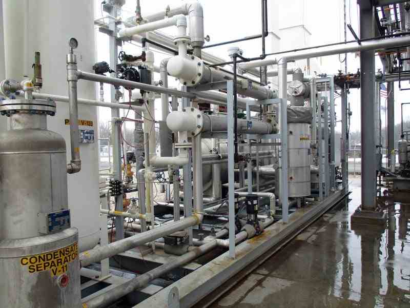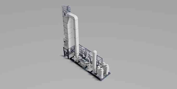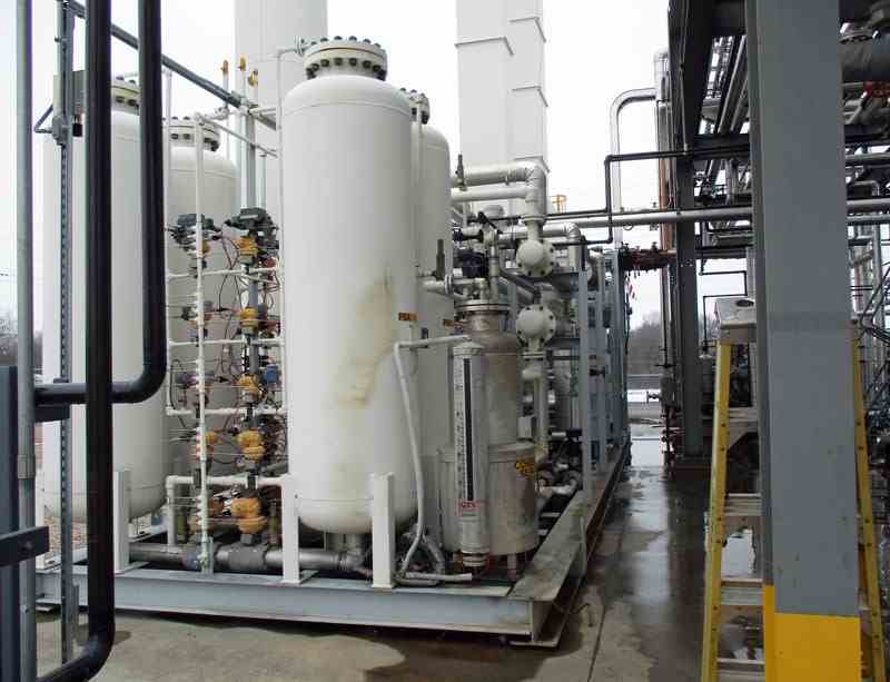 Used 425 Nm3/hr (15,000 SCFH) Hydrogen Plant built by Cotting Industries in 2016. Most equipment is skid mounted. The plant has a double-tube steam methane reformer that is a compact furnace enclosure with a single reaction tube fired on two sides. The furnace enclosure is wide at the bottom to accommodate the burners and tapered at a height several feet above the length of the flames to a narrow upper section. This configuration allows combustion to be completed in the lower section bringing the feed/steam mixture quickly to its reaction temperature. The intermediate side walls channel the flue gas into a turbulent flow condition at the upper section to improve heat transfer and maintain a uniform tube wall temperature along the length of the reaction tube. The reaction tube consists of an annular portion filled with catalyst and a center return tube. The reaction tube is supported from the bottom and allowed to thermally expand upward through the use of a counterweight system attached at the top of the tube. The steam/hydrocarbon feed gas mixture enters the annular section of the reformer reaction tube at the bottom. The feed gas passes upward through the catalyst bed and then downward through the center return tube. Thus, the feed gas flows through the catalyst bed in single pass, co-current heat exchange relationship with the hot combustion gas in the furnace enclosure. Then, the reformed gas flows back to the bottom of the reformer through the center return tube in single pass, counter current heat exchange relationship with the upward flowing feed gas in the catalyst space. The combination of the furnace enclosure geometry and a reaction tube with a center return tube results in an even temperature profile over the length of the tube while maintaining a high thermal efficiency in the furnace.