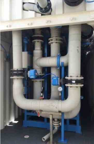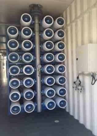 Used and refurbished 7,000 m3/day (77,000 gallons/hour) water desalination plant for sale. Three (3) plants available. The plant runs ultrafiltration followed by reverse osmosis. The plant was built in 2010, shut down in 2013, and underwent complete refurbishment in 2016. Currently idled for quick shipment. Water product specifications: Total Dissolved Solids (TDS) 35,000 mg/L - 45,000 mg/L, Silt Density Index (SDI) < 10, recovery/rejection 35-45% / 98%, pH 4-10, temperature 20-40 degree C. The plant equipment is containerized for easy transportation and set-up. The core RO desalination unit includes 3 containers with the SWRO membrane skids (28 pressure vessels per skid with 7 membrane elements each) and one container with the LP booster (with VFD), high pressure pump, energy recovery devices (8 PX 220 units) and PX energy recovery booster pump (with VFD). The plant needs power supply of 11 KV, 50 Hz, 3 phase. Technical services such as installation and commissioning may be available.
