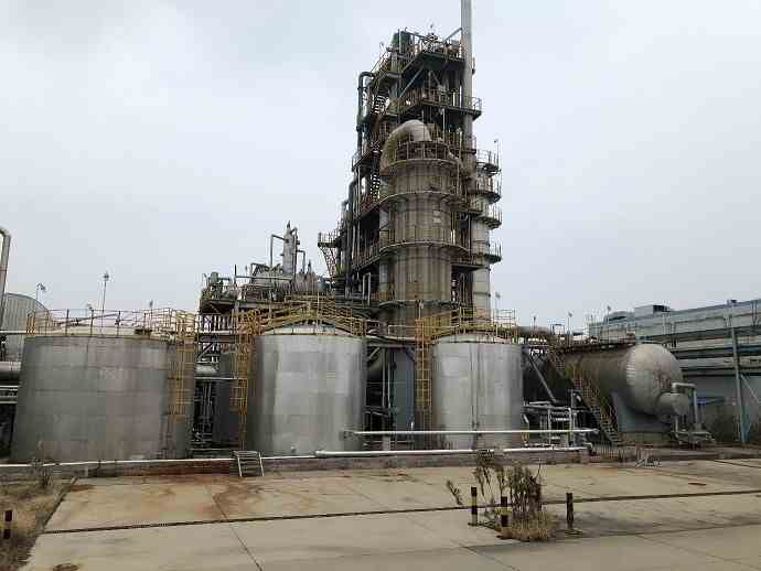 Used 20,000 TPY Maleic Anhydride plant built in 2012 for sale. The plant uses benzene as raw material. The process air from the blower is heated to about 165-170 ° C and enters the vaporizer. The liquid benzene also enters the vaporizer. The liquid benzene is vaporized in the vaporizer and mixed with the air evenly. After mixing, the gas mixture at about 153 ~ 158 ? passes through the catalyst bed from the upper part of the reactor. The temperature is controlled at 420 ~ 450 °C. Reactant gas containing maleic anhydride flows out at the lower part of the reactor at around 370 ° and is cooled by a gas cooler to 140 ° C. After the cooler, it enters the aftercooler and is cooled further to 60 ~ 65 ? by 54 ? by temper water. The maleic anhydride gas entering at the bottom of the absorption tower is absorbed by the circulating acid water and becomes an aqueous maleic acid solution. The maleic acid aqueous solution is metered and sent to the refining tower for dehydration. It is fed into the refining tower with o-xylene gas for azeotrope boiling. When maintaining top the pressure of the tower to be at 20 KPa (A), the main distillate, liquid maleic anhydride, is produced.