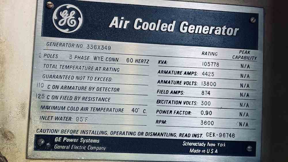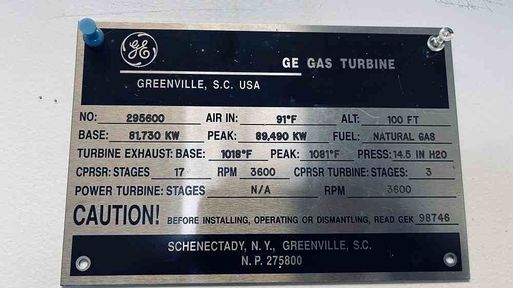 Used 81730 KW gas turbine generator. Manufactured by General Electric. Gas turbine generator set consists of following: GE model 7A1PEA38-1 gas turbine, duel fuel, base rated 81,730 KW, Peak rated 89,490 KW, water injected combustion with inlet air cooled. Heat rate @ Iso 10,480 btu/kwh. 3600 rpm, CCW rotation. Serial #295600. 800 hp starter, manufactured by GE. Model #8213825402. 3570 rpm, frame 8211Z, 2300/4000v, Built 1997. Philadelphia Accessory gear box with atomizing air compressor. Side exhaust to HRSG and steam injected for Nox control. Worthington Natural gas compressor. Liquid fuel pump and supply system. GE TEWAC 105,778 kva generator, 13800V/3ph/60 hz. pf: 0.9. 4425 amps, 300 v exciter volts , field amps 874, 3600 rpm. Serial #336X349. Mark IV control system, EX2000 exciter, GAC with GE Type VVC-13.8-1000-0GV circuit breaker. Total hours 61344. Major inspection and upgrade in 2000. Last overhaul in 2013. 3000 hours since last overhaul. Built 1992, shutdown 2022.