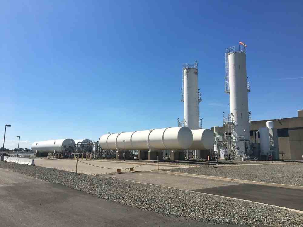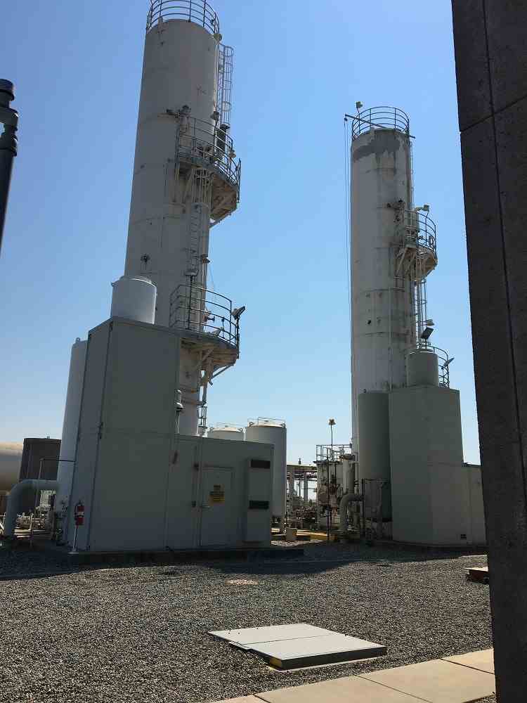 Used (2) x 100 TPD cryogenic oxygen plants. These plants produce oxygen in gas and liquid forms. Air undergoes filtration and compression using 3-stage centrifugal compressors (100% or 70%). Compressed air is then cooled in a water-cooled aftercooler and further cooled in reversing heat exchangers. In the distillation columns, the cold air is separated into oxygen product and waste nitrogen. An intermediate air stream is diverted to the expansion turbine for refrigeration. Liquid oxygen is extracted from the low-pressure column and stored, while gas oxygen is warmed against incoming air and released at 16 Psia. Waste nitrogen cleans the reversing exchanger passages, is warmed against incoming air, and released. Silica gel traps remove entrained hydrocarbons from the main condenser.