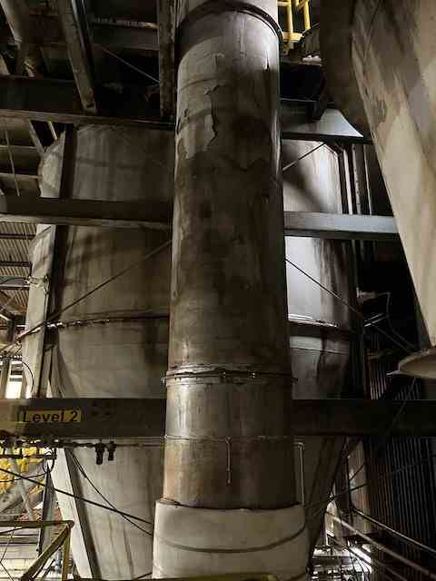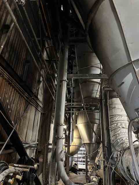 Used 3400 lbs/hr spray drying plant. Manufactured by GEA Niro Inc. 20' Dia x 16' cylindrical height drying chamber, 60° cone bottom provided with rotary valve. 51% feed solids, 50F feed temperature. 1575 lbs/hr evaporation rate with 5% final product moisture. Inlet temperature 430F, outlet temperature 305F. Direct fired heater with gas pipe train and flame safety controls for natural gas.