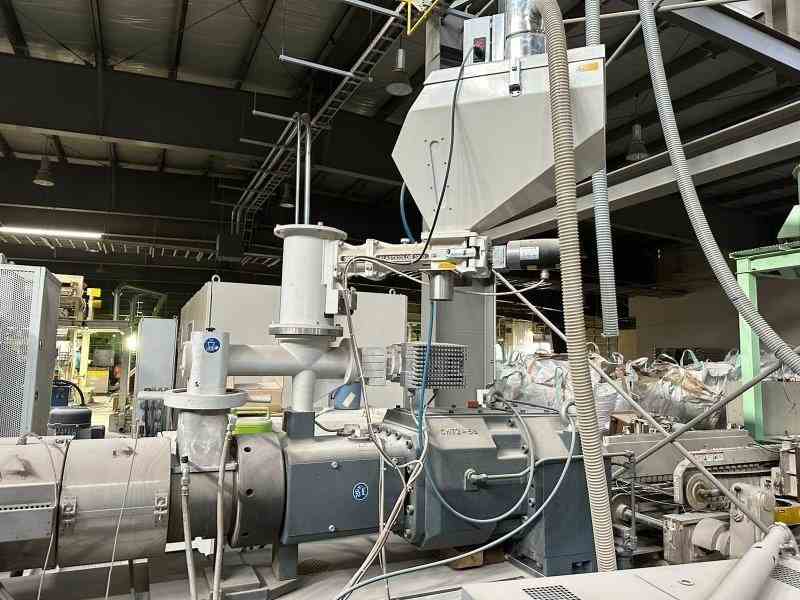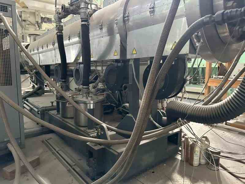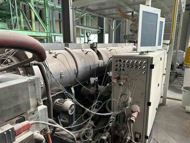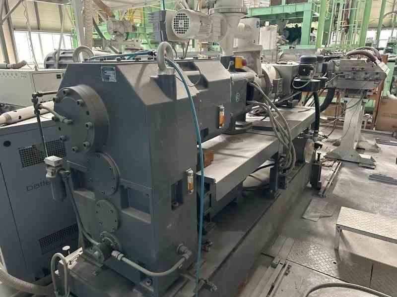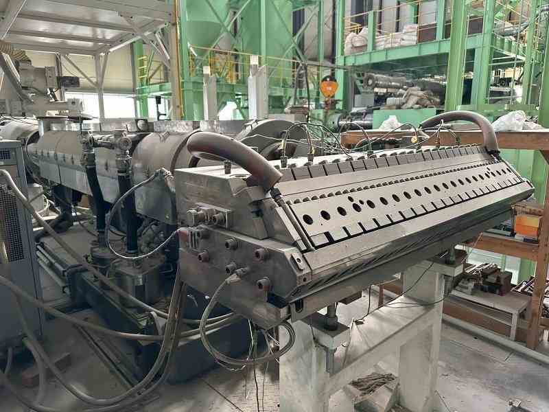 Used PVC board production line manufactured by Battenfeld-Cincinnati of Germany and equipped with a flat die (sheet die) manufactured by EMO of Austria and electric devices by Siemens of Germany. Total maximum output approximately 2,000 Kg/hr. The production line ran 1,100 hours before shutdown. All the equipment manufactured in 2012, currently still installed, in excellent condition. Seller can provide services of disassembly, packing, loading and inland transportation to the nearest seaport.