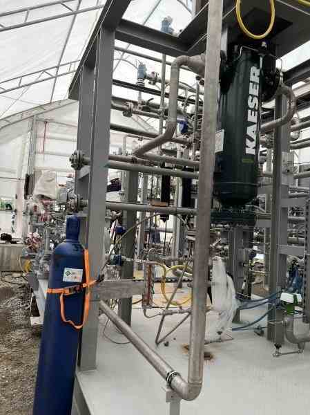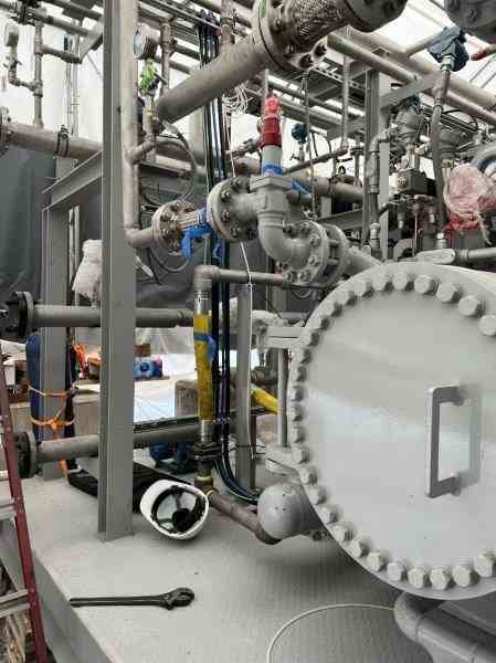 Unused 1,000 Kg/day (491 Nm3/hr) Hydrogen PSA unit, specifically designed to purify hydrogen generated from a chlor-alkali plant and can also be used for purifying hydrogen after sodium chlorate electrolysis or other electrolysis processes. Built in 2023, the system remains in its original crate and packaging, never installed, and preserved under nitrogen. The raw hydrogen gas is saturated with water and enters the purification system at a flow rate of 410 SCFM, 20°C, and 15 psig. It contains approximately 97% hydrogen, 2% oxygen, 0.2% nitrogen, 0.1% carbon dioxide, and 0.7% water. The gas is compressed in a hydrogen screw compressor to approximately 150 psig, then passes through a DeOxo unit to remove most of the oxygen content, forming water. After oxygen removal, the gas is condensed and enters a vertical water separator. The gaseous stream is sent to the Pressure Swing Adsorber (PSA) unit, where most of the impurities in the hydrogen gas, including residual O2, N2, and H2O, are removed. The product gas meets the fuel cell grade specifications SAE (Society of Automotive Engineers) Fuel Cell Gas Composition Standards. It is then sent to the downstream compression stage at a flow rate of >290 SCFM, while the waste gas is vented through the vent stack. It was later indicated that the oxygen content in the raw gas might reach a maximum of 3.5%, which would raise the DeOxo reactor unit temperature to over 500 °C. A hydrogen recycle stream is implemented to dilute the O2 entering the reactor, but this reduces the system's processing capacity.
