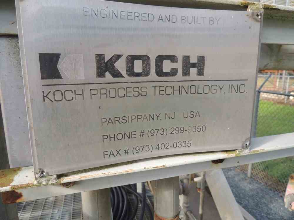 Used skid-mounted DMF (Dimethylformamide) solvent recovery distillation system designed by KOCH to recover 14-35% DMF from wastewater. The system consists of a Distillation Column (CL-7001) with Koch-Glitsch valve trays, Feed Preheater (HE-7001), Steam Heater (HE-7002), Reboiler (HE-7003), Product Cooler (HE-7004), Column Condenser (HE-7005), Bottom Purge Cooler (HE-7006), Heat Recovery Condenser (HE-7007), Reflux Drum (TK-7002), Bottoms Pump (PU-7002), Product Pump (PU-7003), and Reflux Pump (PU-7004). Utilities consist of steam, cooling water, electricity, and instrument air.
