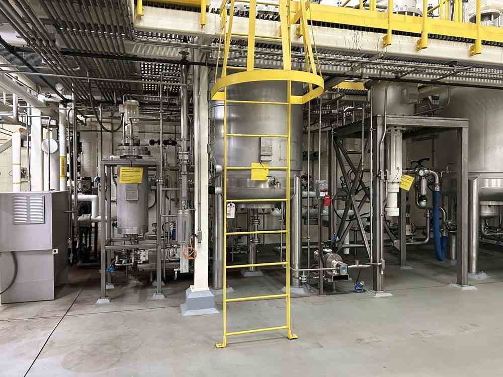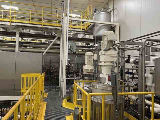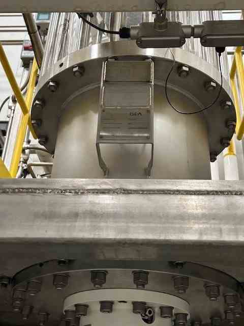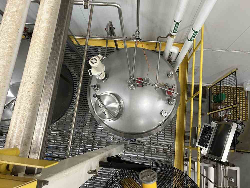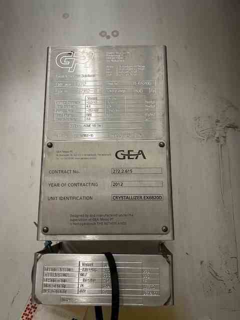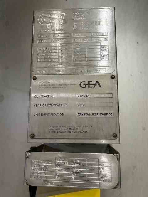 Used 1100 lbs/hr freeze concentration system. Manufactured by GEA MESSO. The unit is a two-stage crystallization system with a capacity of processing coffee concentrate at 34 wt%, built for high-efficiency freeze concentration. Consiting of (2) 3,330 liters (872 gallon) stainless steel jacketed crystallizers. Internal rated 43.5 psig @-13/+203F. Jacked rated 43.5 psig @-13/+203 F. Double-jacketed vessels to enable precise cooling using a Dynalene® HC30 cooling liquid, maintaining temperatures as low as -30°C. (1) 666 mm dia Wash column manufactured by SRO-Netherland. The system utilizes a wash column to separate ice crystals from the concentrated product, with an integrated piston-driven filtration system. Rated 1450 psi @-4/+140F. System includes (1) gallon stainless steel feed tank. Rated 6 psi @-13F/203F, Equipped with a R507A compressor for refrigeration and a Siemens PLC-controlled system. The feed (coffee solution of 6.5 - 7.5 wt%) will be supplied to feed tank TK68400. The feed has a temperature of 4 C. From there the feed is supplied to the crystallizer EX68200 (second stage). In both crystallizers an amount