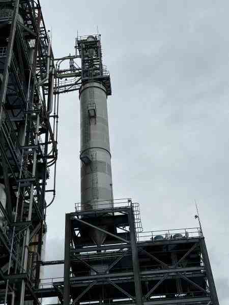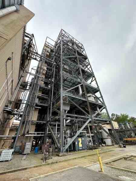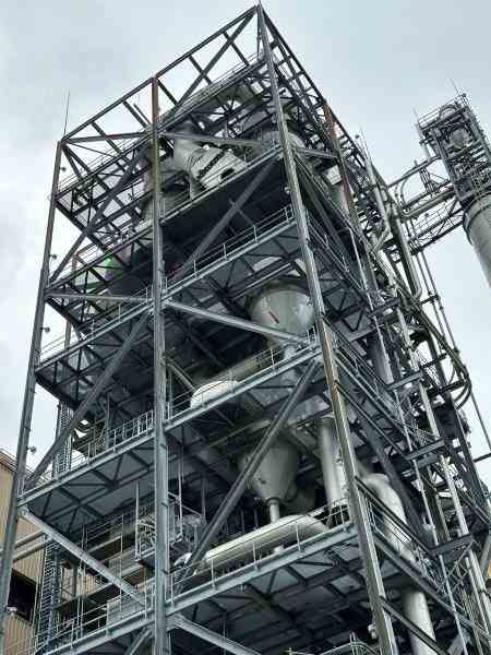 450 TPD PET SSP (Solid-State Polycondensation) plant. Consisting of four-step process for polymer enhancement. The process begins with Crystallization, where amorphous PET chips are transformed into a crystalline form using a Spout Bed Heat Exchanger (OTWR) in the Pre-crystallizer, followed by a PULSBED fluid-bed heat exchanger (OTWG) in the Crystallizer. Next, the Preheating stage employs a Vertical Flow Roof Heat Exchanger (OKTD) to raise the temperature of the crystalline chips to near-reaction conditions. In the third step, Solid-State Polycondensation (SSP) occurs in a Vertical Mass Flow Reactor (OKTN), where molecular weight increases through controlled diffusion-driven reactions under vacuum or inert gas. Finally, the process concludes with Cooling, again utilizing the PULSBED fluid-bed heat exchanger (OTWG) to stabilize the material before downstream handling.