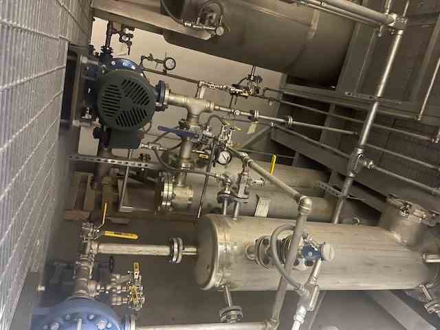 Utility requirements include 575V, 3-phase and 120V, 3-phase electrical connections. The system requires 1100 lb/hr of steam at 100 PSIG, along with chilled water supplied at 349 L/min at 5°C. Instrumentation is supported by 20 SCFM of compressed air at 100 PSIG. Drainage access is required for proper installation and operation. The system has been fully preserved in unused condition since fabrication and is suited for food-grade ethanol recovery and industrial distillation applications. Built in 2017, never used due to project cancellation.
