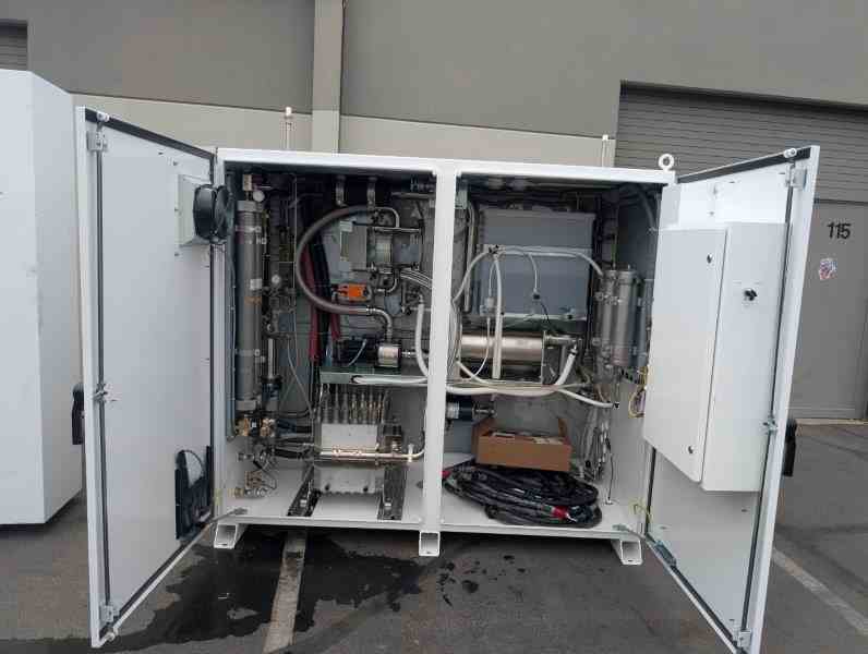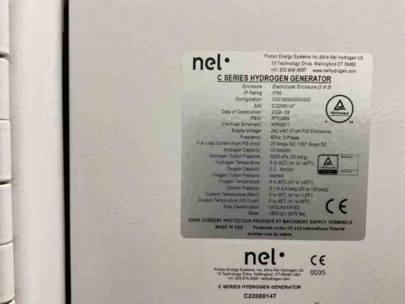 Used 10 Nm3 (380 SCF/h) hydrogen generator, manufactured by NEL. Model C-10. 99.999+% pure hydrogen production rated @435psig., consumes 6.2 kWh/Nm³ (16.3 kWh/100 SCF) power. 240V/60Hz/3Phase motor. Includes Proton Exchange Membrane (PEM) – Caustic Free. < 1 ppm v O2-Content in H2 and < 2 ppm v water content in H2. Consisting of an Electrolyser Enclosure and a power supply enclosure. Very low hours, Built 2022.
