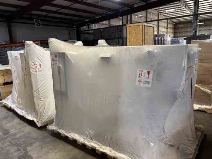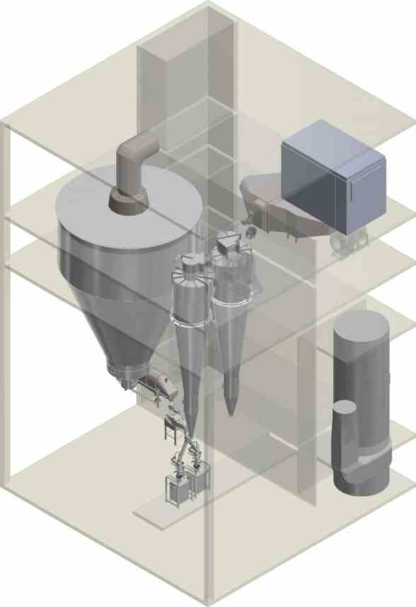 Unused, never-installed 2,000 Kg/Hr spray dryer plant designed by SiccaDania for hydrolyzed animal protein powder. The plant includes feed system, spray dryer system, big bag packaging system and CIP system. Primary data: feed rate 5,450 kh/hr, total solids in feed 35%, temperature of feed 79 °C, water evaporation 3,442 Kg/Hr, powder production 2,000 kg/hr, moisture in powder 5%. In the feed system, high pressure of up to 250 bar is used by 5 atomization nozzles. The spray dryer system is equipped with main air handling system and adsorption dehumidifier which enhance the plant performance in summer. The plant’s air powder separation system consists of two parallel high efficiency SiccaDania VTK cyclones. The spray dryer plant is designed for CIP cleaning of all areas getting in contact with powder. The CIP liquids will be supplied from the CIP system at the required concentration, flow, pressure and temperature and pressure. SiccaDania Daniatech Double Bigbag filling system (BBF), with 4 lifting straps is filled with bulk density of 0.4 – 0.7 kg/L according to load cells signal. Filling speed up to 10 bags per hour. Chang-over time 2 -3 minutes.
