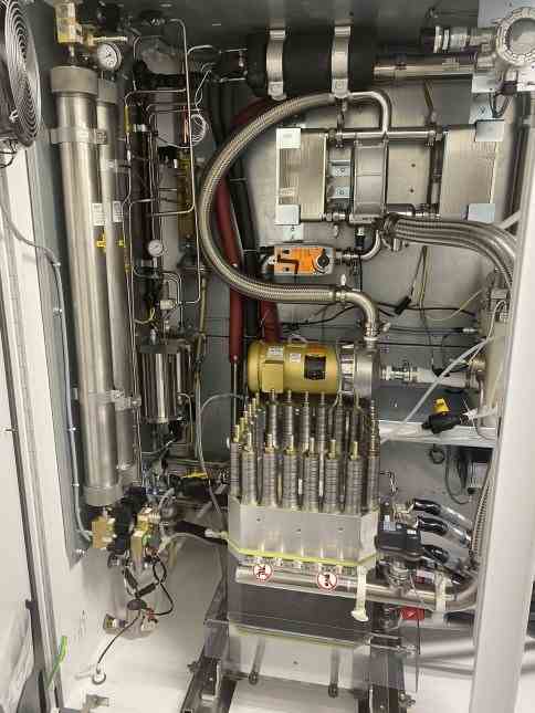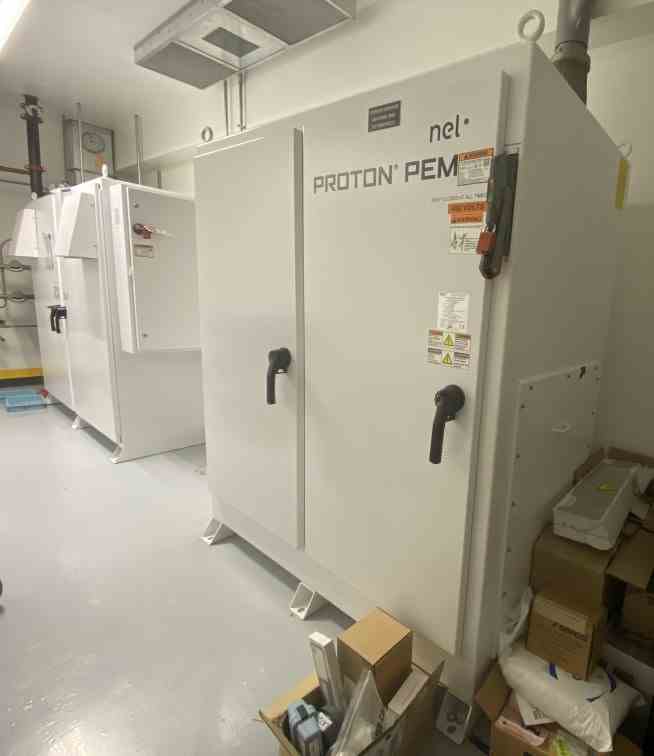 Like-new, barely used hydrogen gas generator supplied by Proton Energy Systems (model C30). This model is a factory-matched and packaged PEM electrolysis system that produces high purity (99.9995%) hydrogen from water and electricity. It is certified to ISO 22734-1. The generator has two enclosures: (1) Power Supply Enclosure. IP rating: PS Encl IP56; 480 VAC 60 Hz 3 phases; coolant temperature and pressure: 5 – 35 °C and 2.1 – 6.9 barg. (2) Electrolyzer Enclosure. IP rating 54; 480 VAC 60 Hz 3 phases; hydrogen output temperature and pressure 5 – 60 °C and 30 barg; coolant temperature and pressure: 5 – 50 °C for main, 5 – 50 °C for H2 dryer, 2.1 – 6.9 barg; oxygen output 15.9 Nm3/hr (vented); full load current from the power supply enclosure 22 Amps AC, 1307 Amps DC. Power consumed per volume of H2 gas produced 5.8 KWh/Nm3. Production turndown range 0 – 100%.